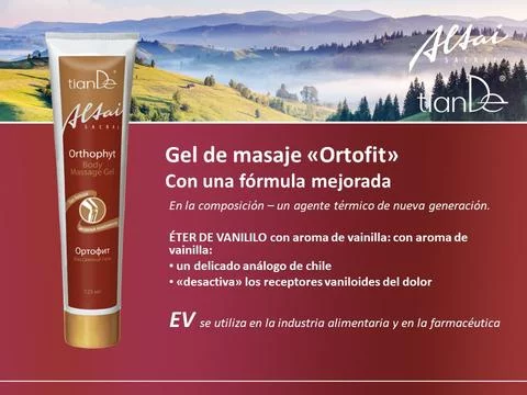 Altai Sacro con Cera de Abejas, Aceite de Oliva y Menta. TIANDE Gel de masaje «Orthophyt» funciona calentamiento, mejora la microcirculación en y alrededor de las articulaciones, lo que favorece a mejorar el metabolismo. La fórmula de gel única permite que sus ingredientes activos absorbidos rápidamente.